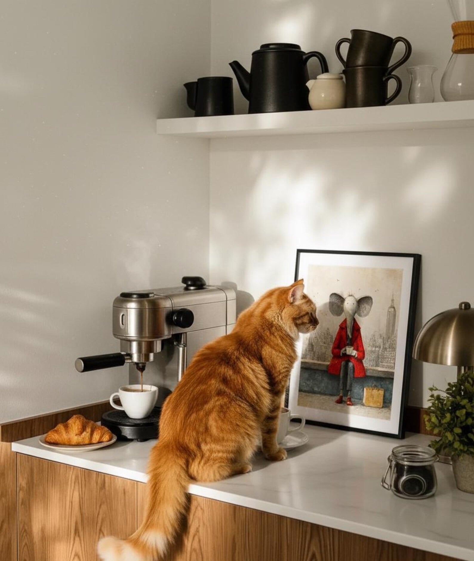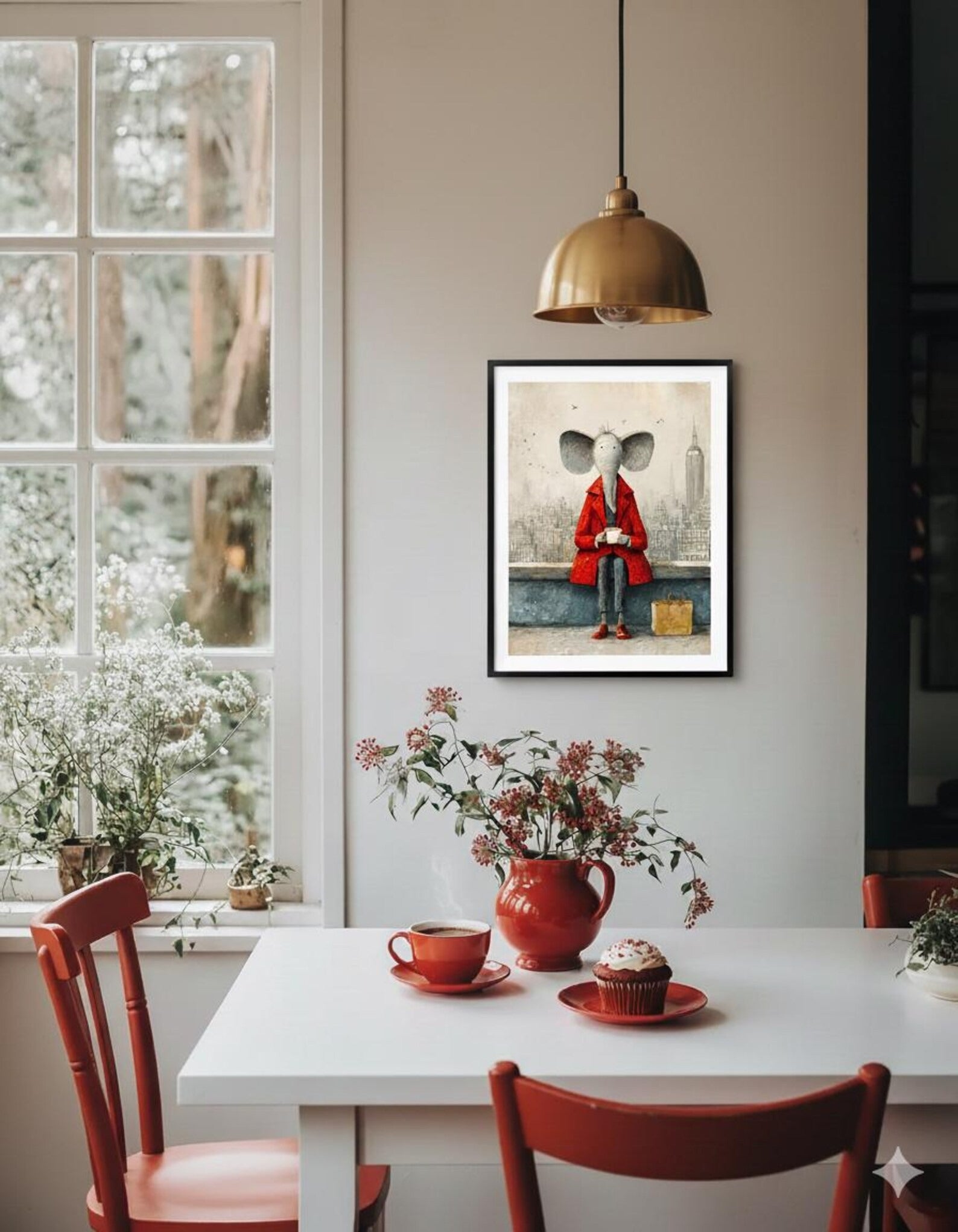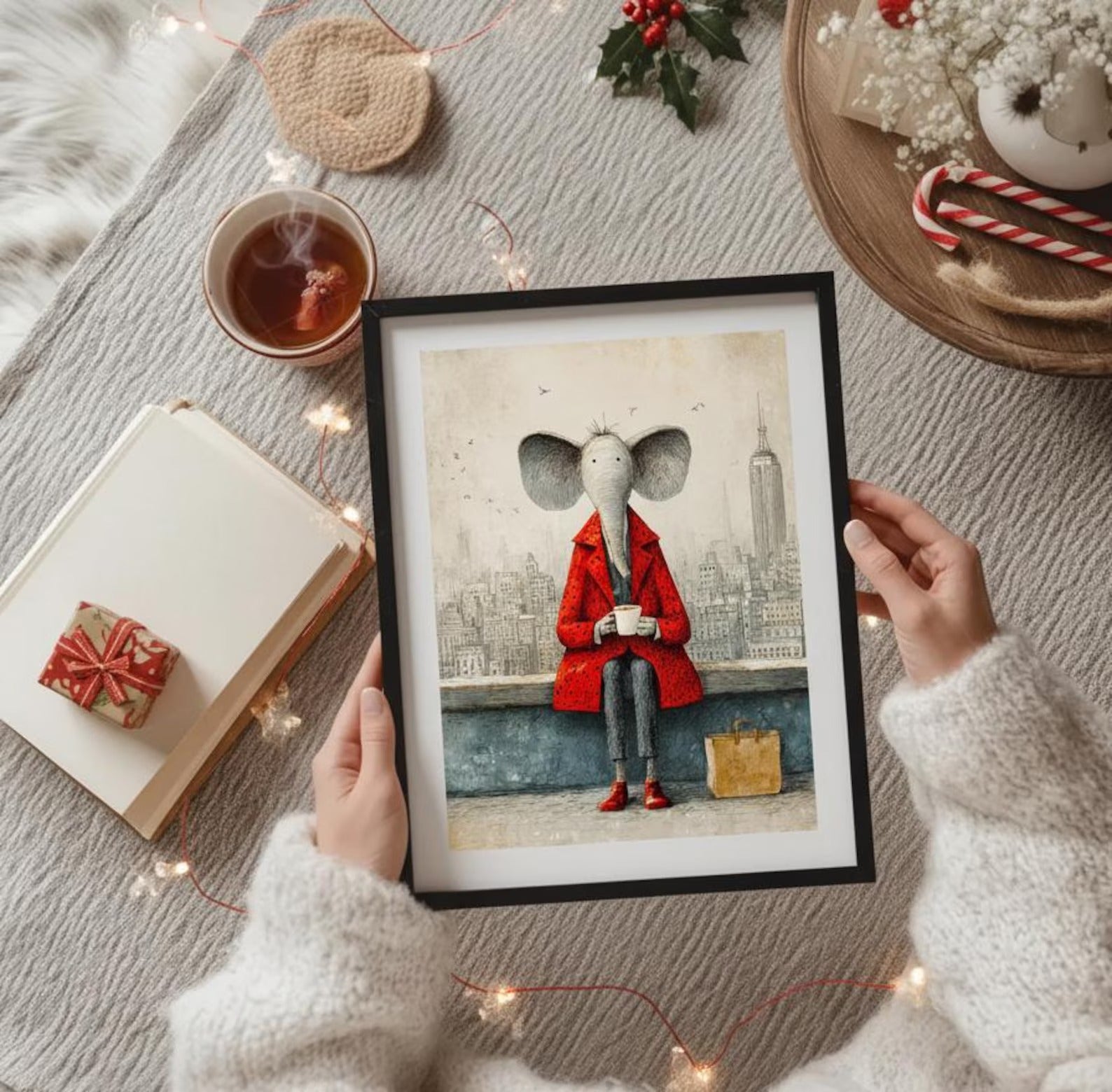 A stylish elephant sipping coffee against a city skyline — the perfect mix of charm, humor, and sophistication. This playful artwork blends surreal storytelling with fashionable urban vibes, making it a conversation starter in any modern space.