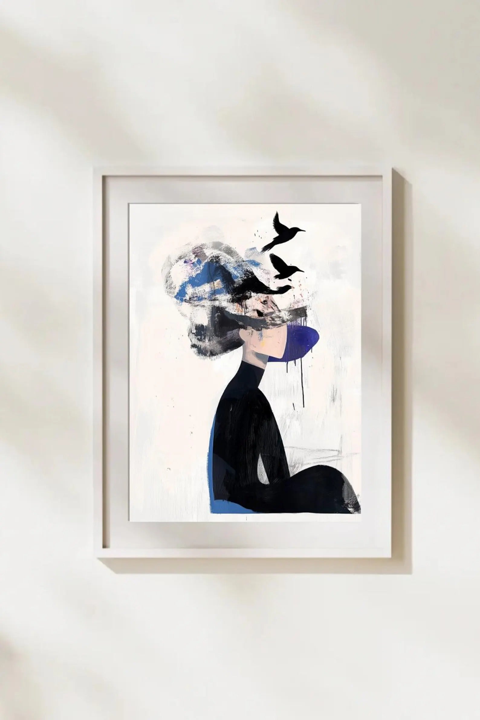 A surreal portrait where the boundaries between thought and flight blur. This expressive artwork portrays a woman dissolving into brushstrokes and birds — a visual metaphor for freedom, chaos, and imagination. Perfect for lovers of abstract art and poetic symbolism.