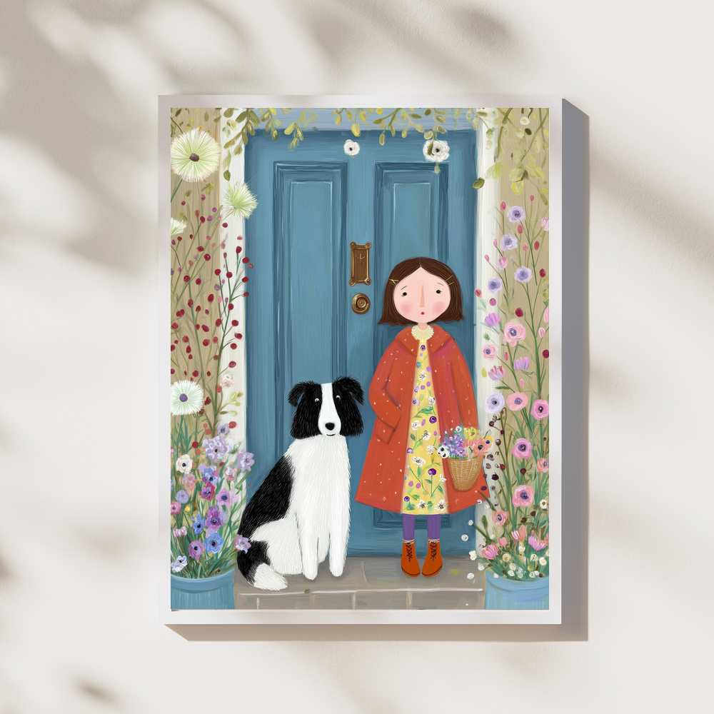 A tender and heartwarming illustration of a girl standing beside her loyal dog in front of a charming blue door, surrounded by blooming flowers. This piece captures the warmth of home, friendship, and quiet joy — perfect for cozy interiors and cottagecore aesthetics.