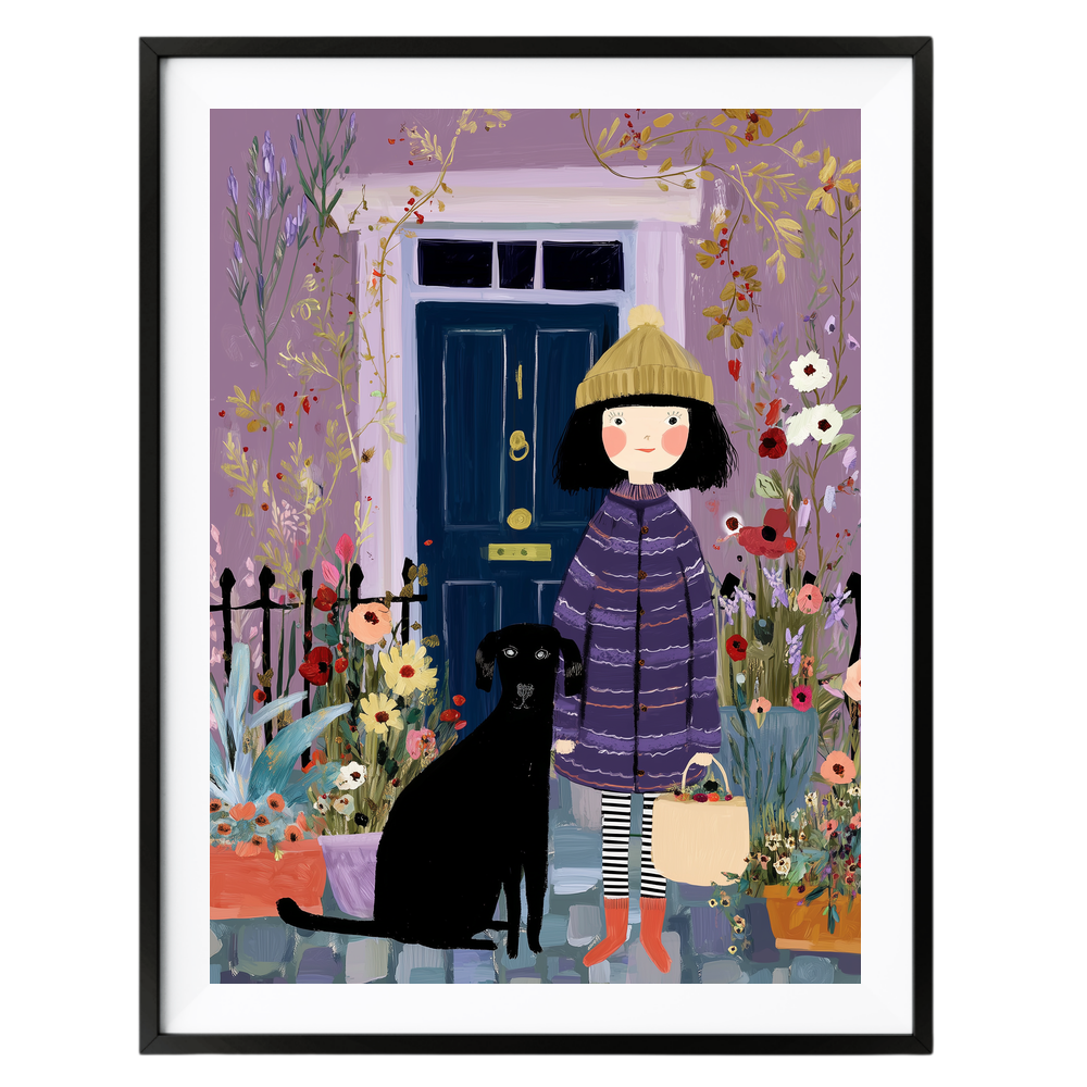 A sweet and cozy illustration of a girl standing with her loyal black dog in front of a charming garden door. With blooming flowers, soft pastel tones, and a touch of storybook warmth, this artwork brings joy and calm to any room.